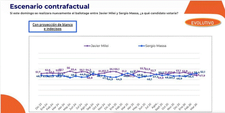 Un estudio de las consultoras Alaska y Trespuntozero difundido en redes sociales mostró un “escenario contrafactual” de balotaje entre el presidente Javier Milei y el ex ministro de Economía Sergio Massa, con una serie mensual de intención de voto entre diciembre de 2023 y marzo de 2026, con proyección de voto en blanco e indecisos.