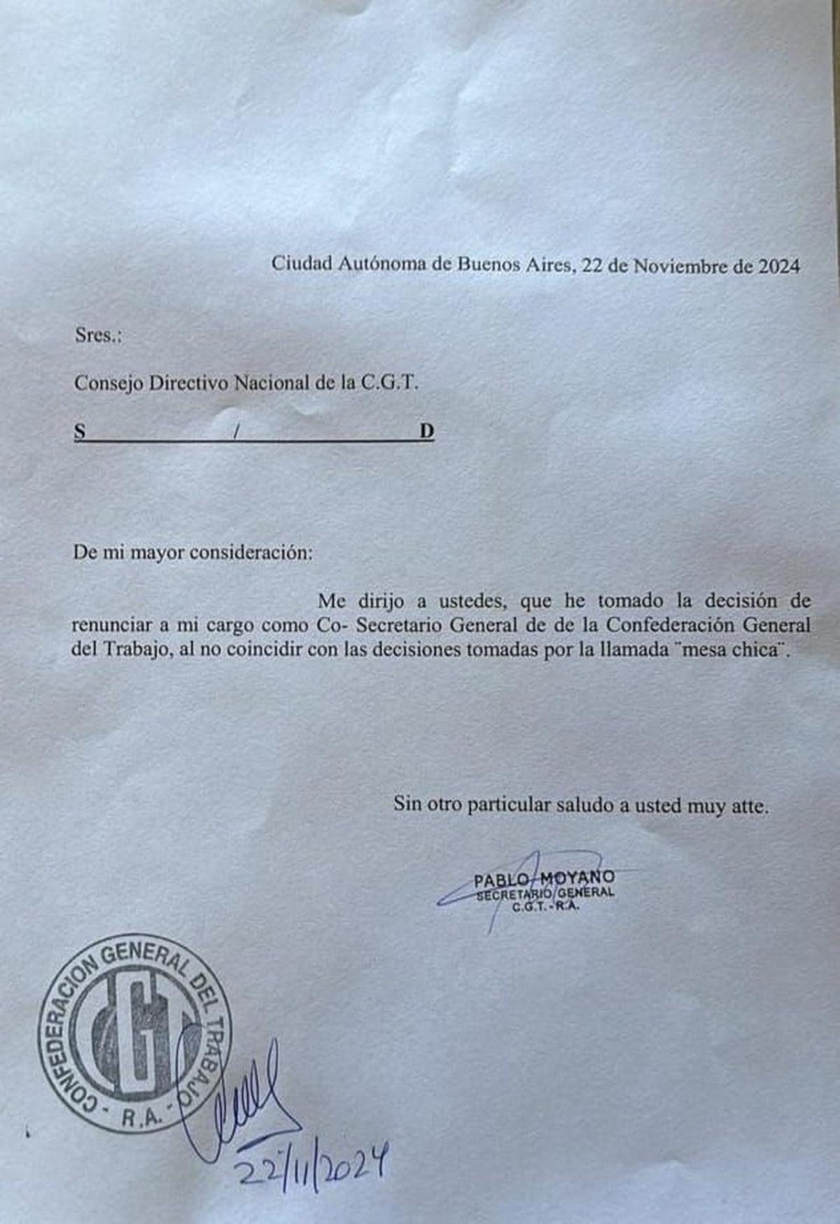 En su carta, Moyano expresa: "Me dirijo a ustedes, que he tomado la decisión de renunciar a mi cargo como Co- Secretario General de la Confederación General del Trabajo, al no coincidir con las decisiones tomadas por la llamada 'mesa chica'".